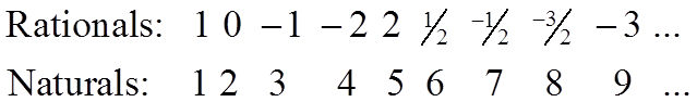 What about Rational Numbers then? Surely there’s way more fractions than there are whole numbers. After all, there’s an infinite number of fractions even between 0 and 1 (1/2, 1/3, 1/4, 1/5, 1/6, …). Well it turns out that no, there is actually the same number of rationals as there are naturals. It works like this.